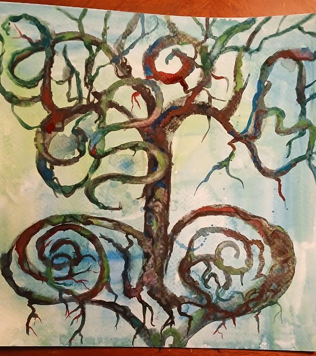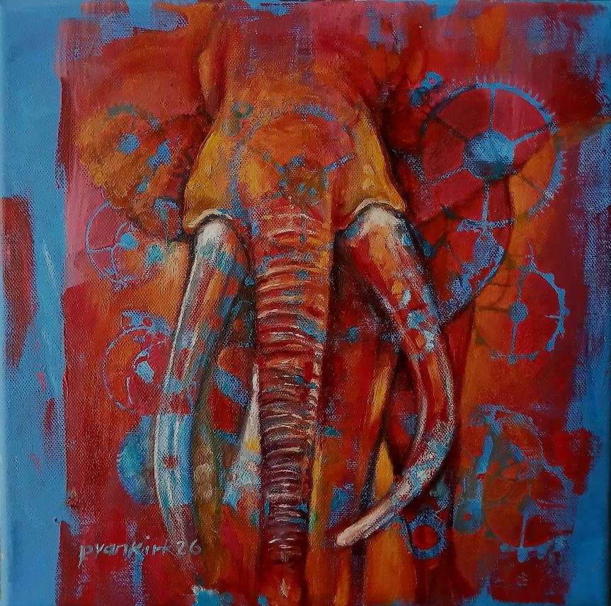 9 x 9 Acrylic on recycled art. The body is the wisdom tree. The mind is a bright mirror in a stand. Take care to wipe it all the time and allow no dust to cling.